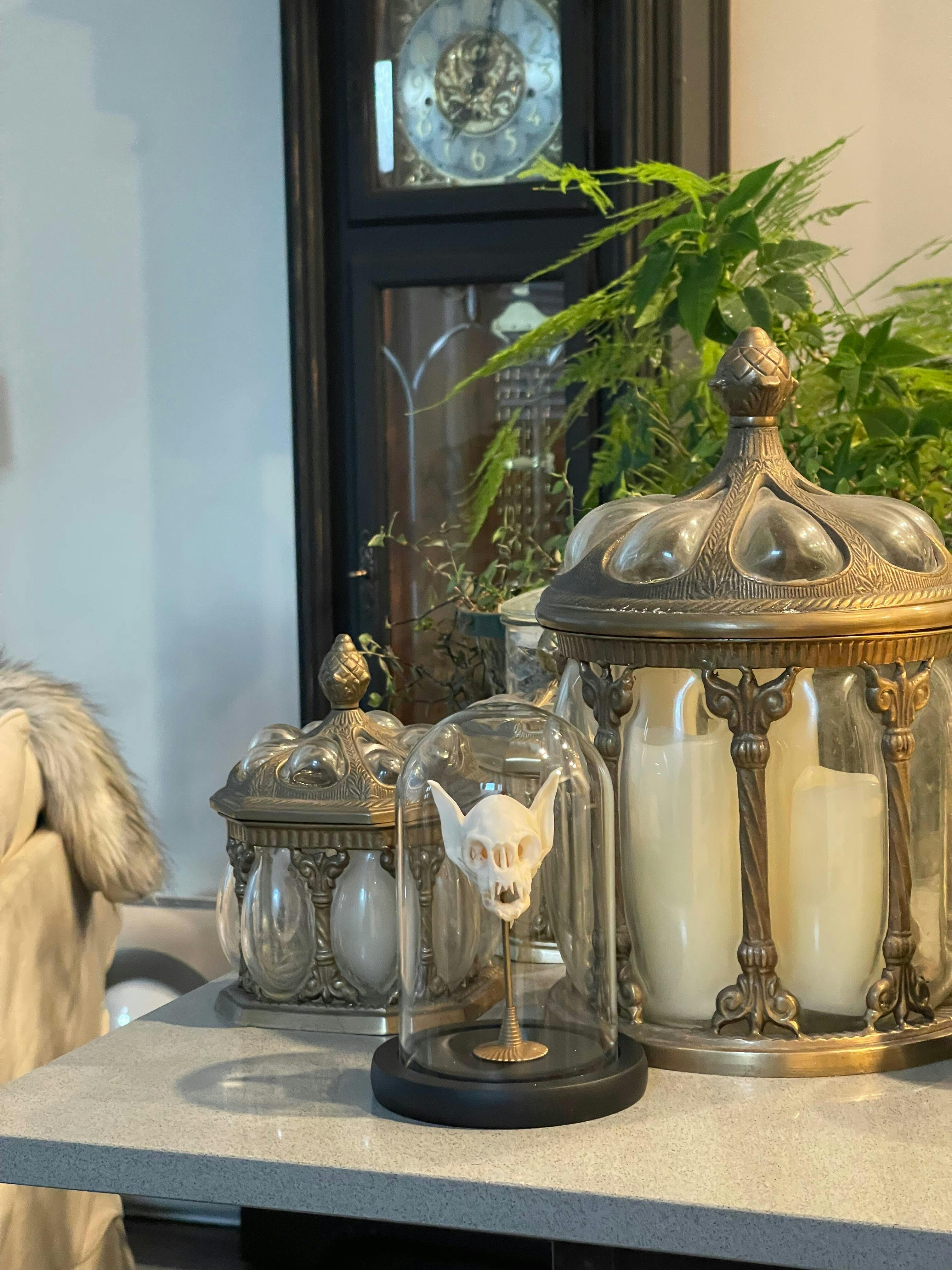 This specimen has been mounted on a 1/8" brass rod with mounting décor as shown in the photo. The wood base is painted flat black and topped by a real glass globe as seen in the photos.
